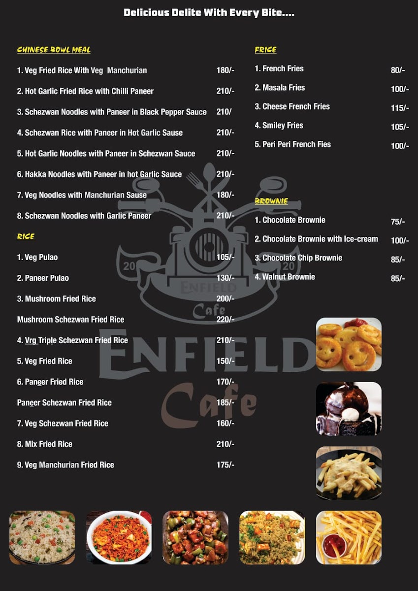 Introducing the menu at Enfield Cafe, nestled in Nandanvan, Nagpur, a culinary haven for food enthusiasts. This cafe impresses with a wide array of vegetarian dishes that tantalize the palate. Highlights include the irresistible Veg Manchurian, Chilli Gobi, and Paneer 65. For rice lovers, options like Paneer Pulao and Mushroom Schezwan Fried Rice shine brightly.